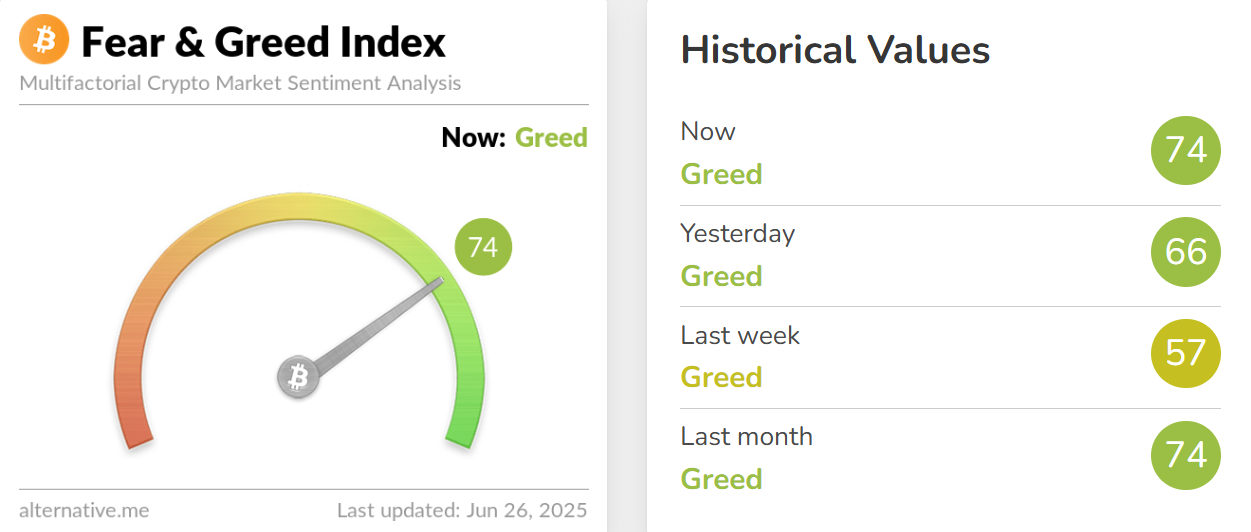 深潮 TechFlow 消息,6 月 26 日,据 Alternative.me 数据,今日加密货币恐慌与贪婪指数升至 74(昨日该指数为 66),表明市场仍处于「贪婪状态」。