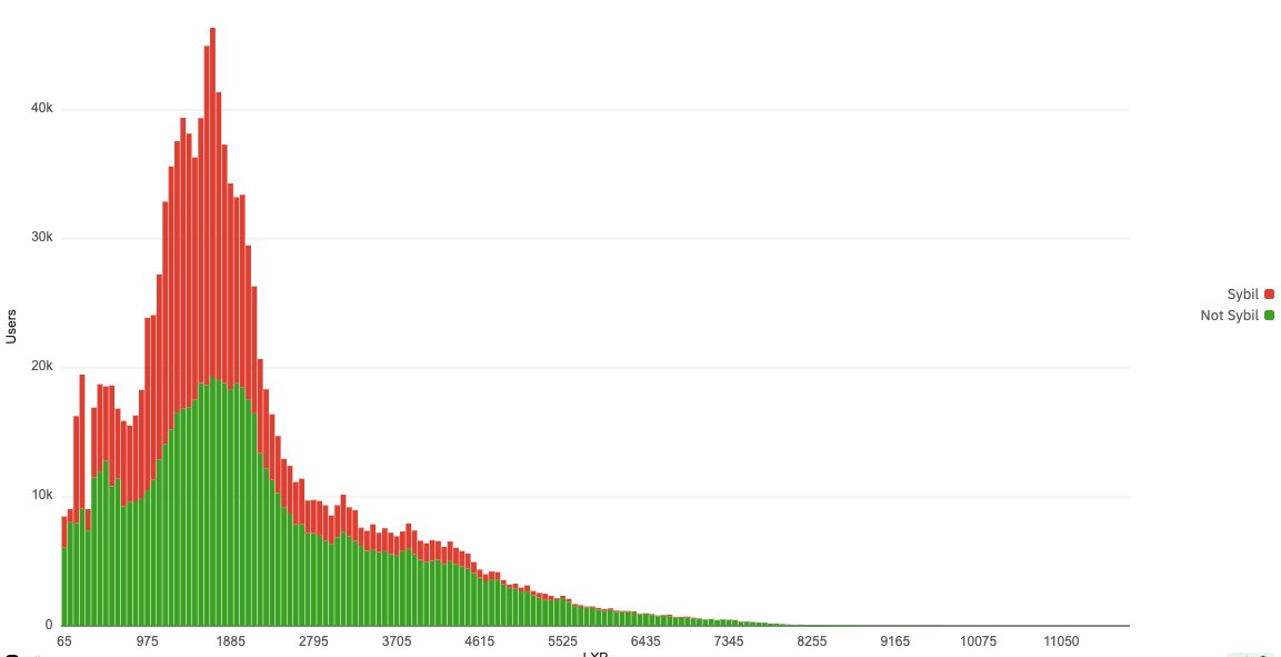 深潮 TechFlow 消息,8 月 28 日,据Nansen分析数据显示,Linea LXP激励计划中大量用户被识别为”Sybil”(女巫攻击)账户。图表数据清晰展示,在积分分布的高峰区域(约1000-2000积分范围),红色部分(被标记为Sybil账户)明显多于绿色部分(正常账户)。