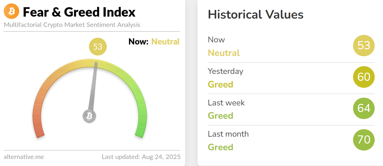深潮 TechFlow 消息,8 月 24 日,据 Alternative.me 数据,今日加密货币恐慌与贪婪指数降至 53(昨日该指数为 60),表明市场由「贪婪状态」转为「中性状态」。