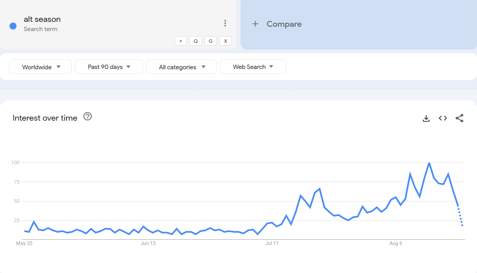 深潮 TechFlow 消息,8 月 20 日,据 Google Trends 数据显示,由于比特币和山寨币在过去六天持续回落,“alt season(山寨季)”一词的全球搜索热度从 8 月 13 日的 100 分下降至当前的 18 分。