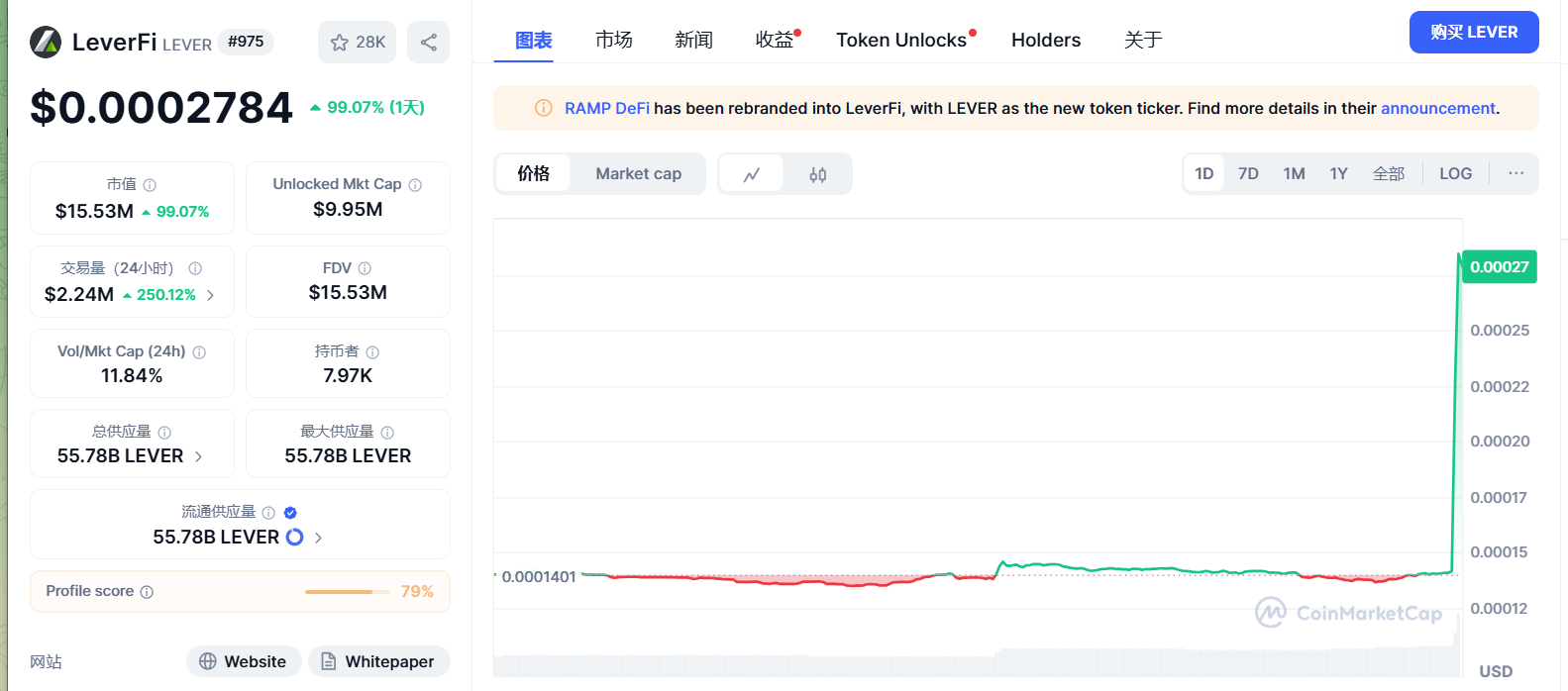 深潮 TechFlow 消息,8 月 29 日,据 Coinmarketcap 行情数据,LEVER 短时涨约100%,市值升至 1500 万美元。