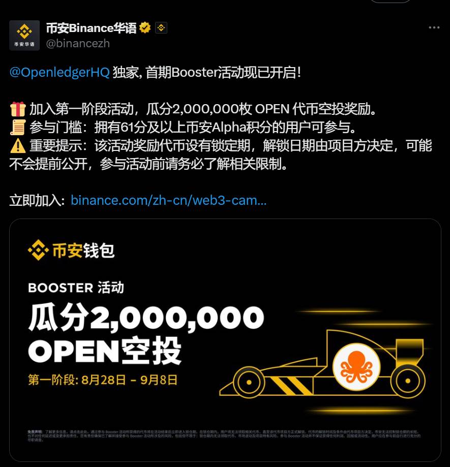 深潮 TechFlow 消息,8 月 29 日,据官方公告币安钱包宣布 Openledger 的首期 Booster 活动已开启,活动将瓜分 200 万枚 OPEN 代币空投奖励。参与门槛为用户需拥有 61 分及以上币安 Alpha 积分。