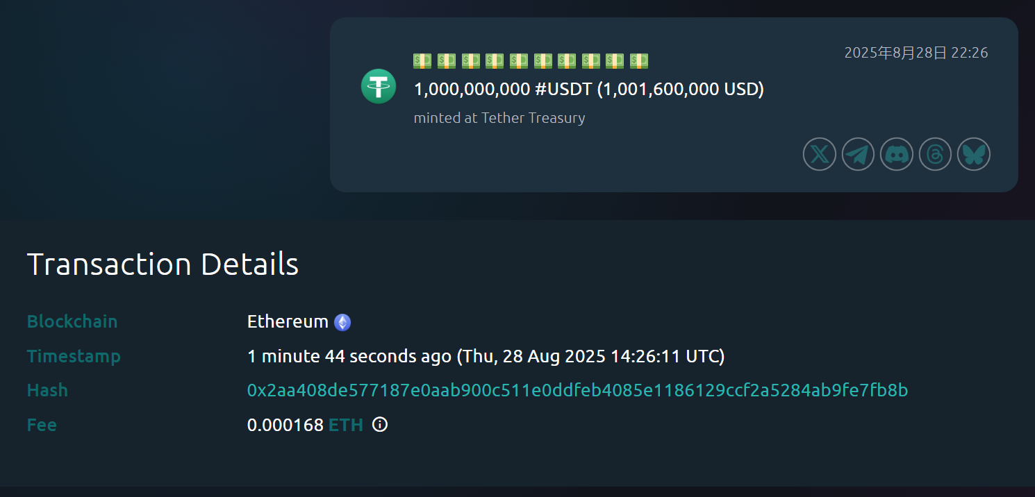 Tether Treasury 在以太坊链上新增铸造了 10 亿枚 USDT