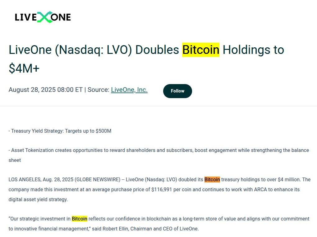深潮 TechFlow 消息,8 月 28 日,据官方公告,美股上市公司 LiveOne 宣布增持约 200 万美元 BTC,总持仓量达 34.2枚