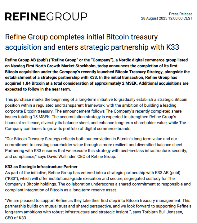 深潮 TechFlow 消息,8 月 28 日,据 NLNico 消息,瑞典上市公司 Refine Group AB 已启动其比特币储备计划,首次购入 1.84 枚比特币,同时与加密货币研究机构 K33 达成合作。