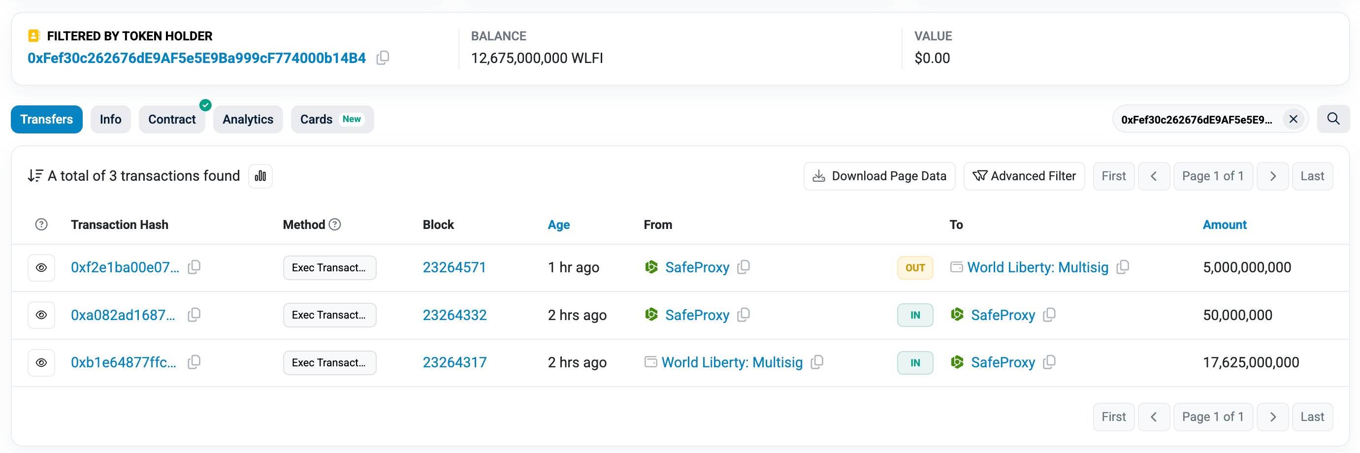 深潮 TechFlow 消息,9 月 1 日,据链上分析师 Ai 姨(@ai_9684xtpa)监测,约 2 小时前,WLFI 官方多签将 176.25 亿枚代币转移至合约地址 0xFef…b14B4,随后将其中 50 亿枚转回多签地址。这是该地址近 11 个月以来金额最大的单笔交易,用途未知。