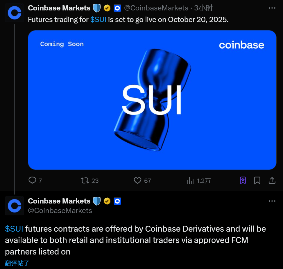 深潮 TechFlow 消息,9 月 30 日,据官方公告,Coinbase 今晨宣布将于 10 月 20 日上线 SUI 期货交易。SUI 期货合约由 Coinbase Derivatives 提供,并将通过 FCM 合作伙伴在 Coinbase 上市,供散户和机构交易者使用。