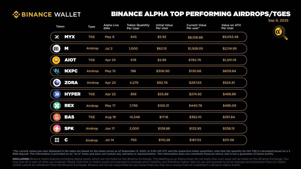 币安 Alpha 发布空投代币价值前十榜单:MYX 以单号9053 美元排名第一