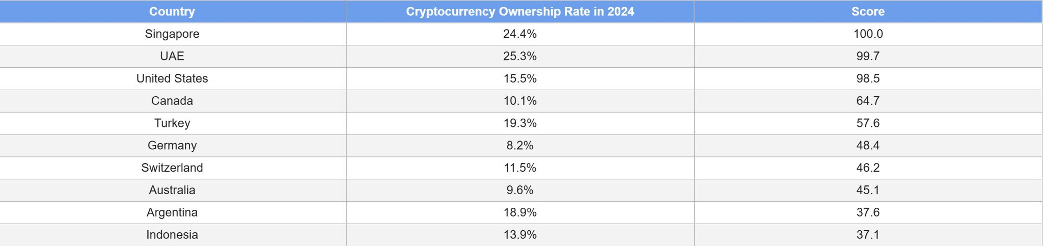 当前全球加密货币采用率排名前三国家为:阿联酋(25.3%)、新加坡( 24.4%)、土耳其(19.3%)