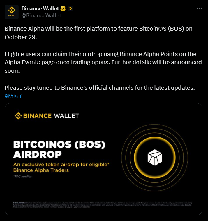 币安 Alpha 将在 10 月 29 日上线 BitcoinOS (BOS),符合条件的用户可申领空投