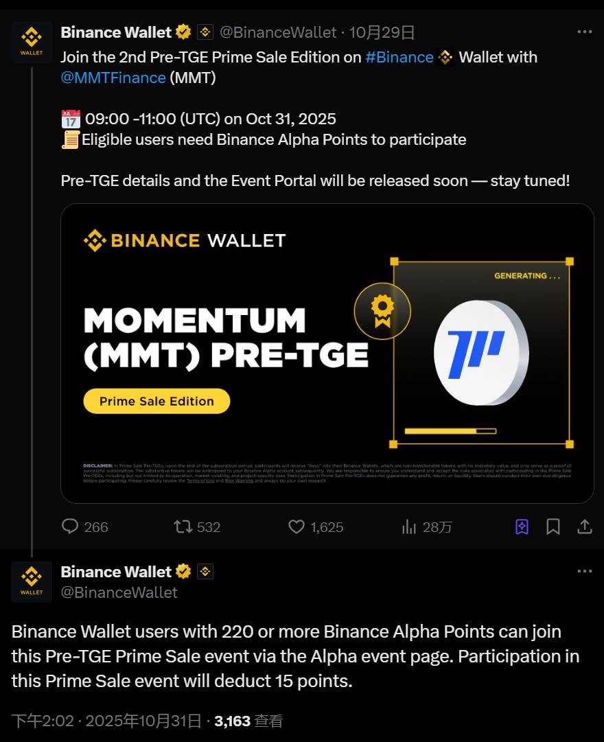 币安钱包: MMT 独家 Pre-TGE Prime Sale 参与门槛为 220 Alpha 积分