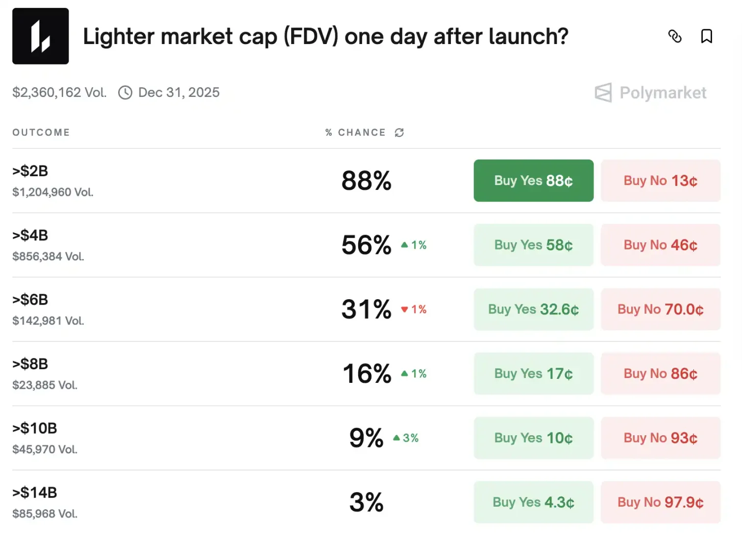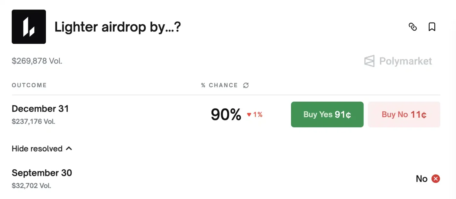 Polymarket 的数据进一步印证了这一预期,显示 Lighter 在 12 月 31 日前完成空投的概率高达 90%。这意味着参与者可能在年底前就能收到期待已久的代币奖励。