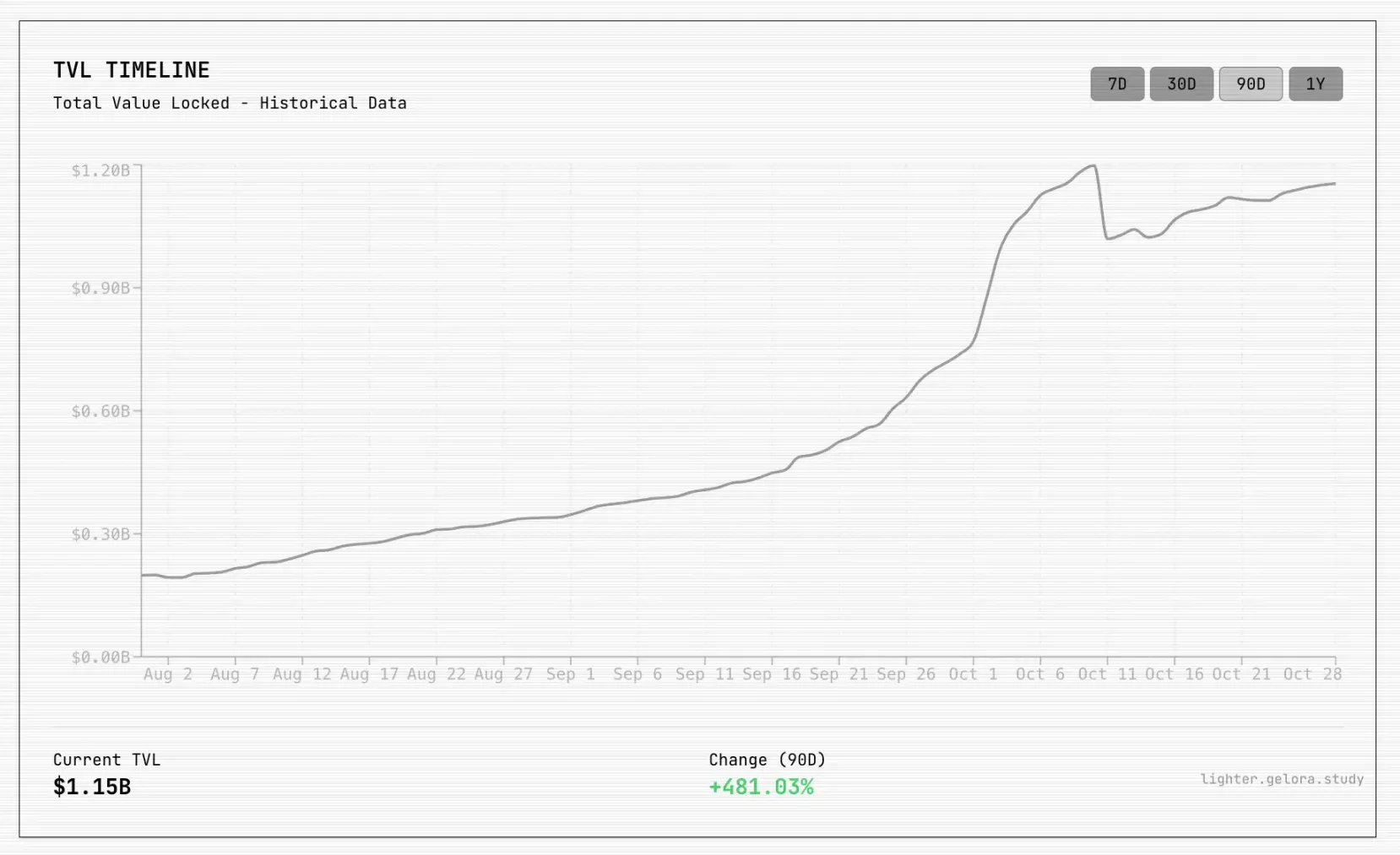 据社区制作的仪表盘网站和 ighterlytics 数据显示了 lighter 的数据增长,lighter 目前的 TVL 为 1.15B,过去三个月增长率为 481%。