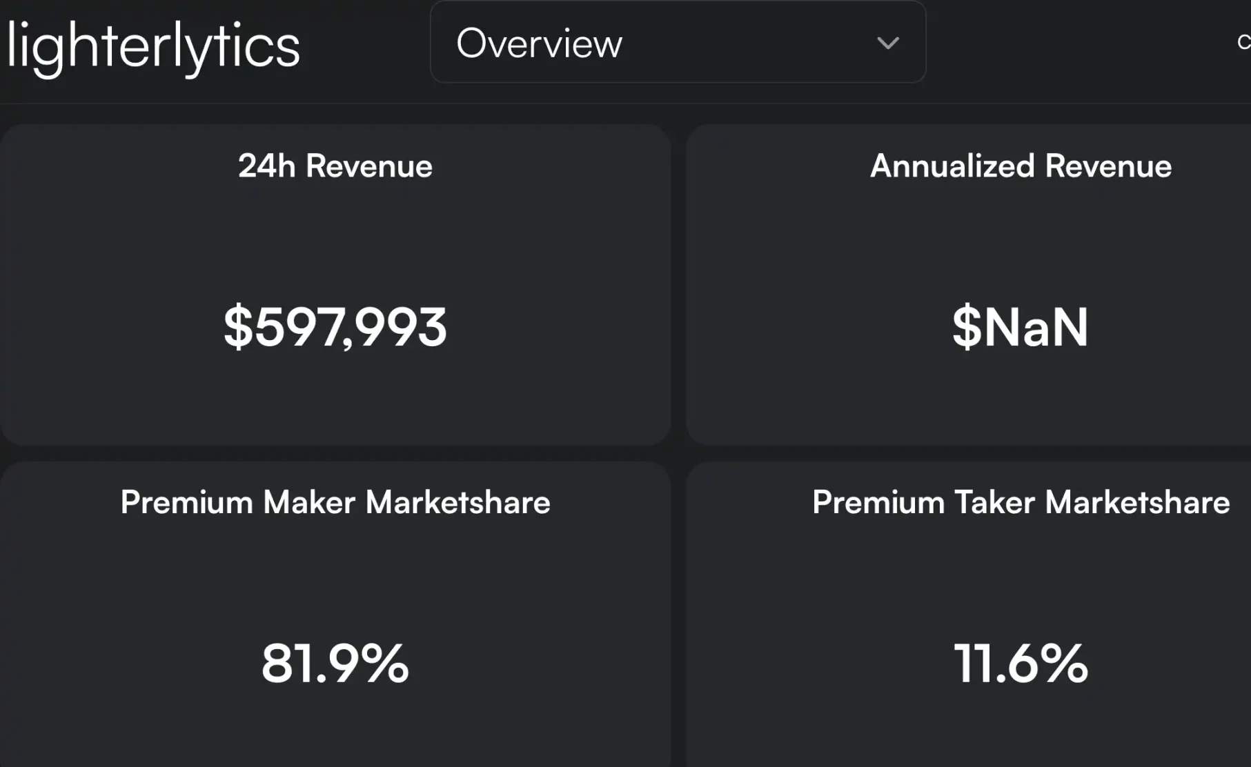 24 小时收入达到 59.8 万美元,显示平台交易活跃度极高。做市商占据主导地位,Premium Maker 市场份额达 81.9%。Premium Taker 市场份额为 11.6%。