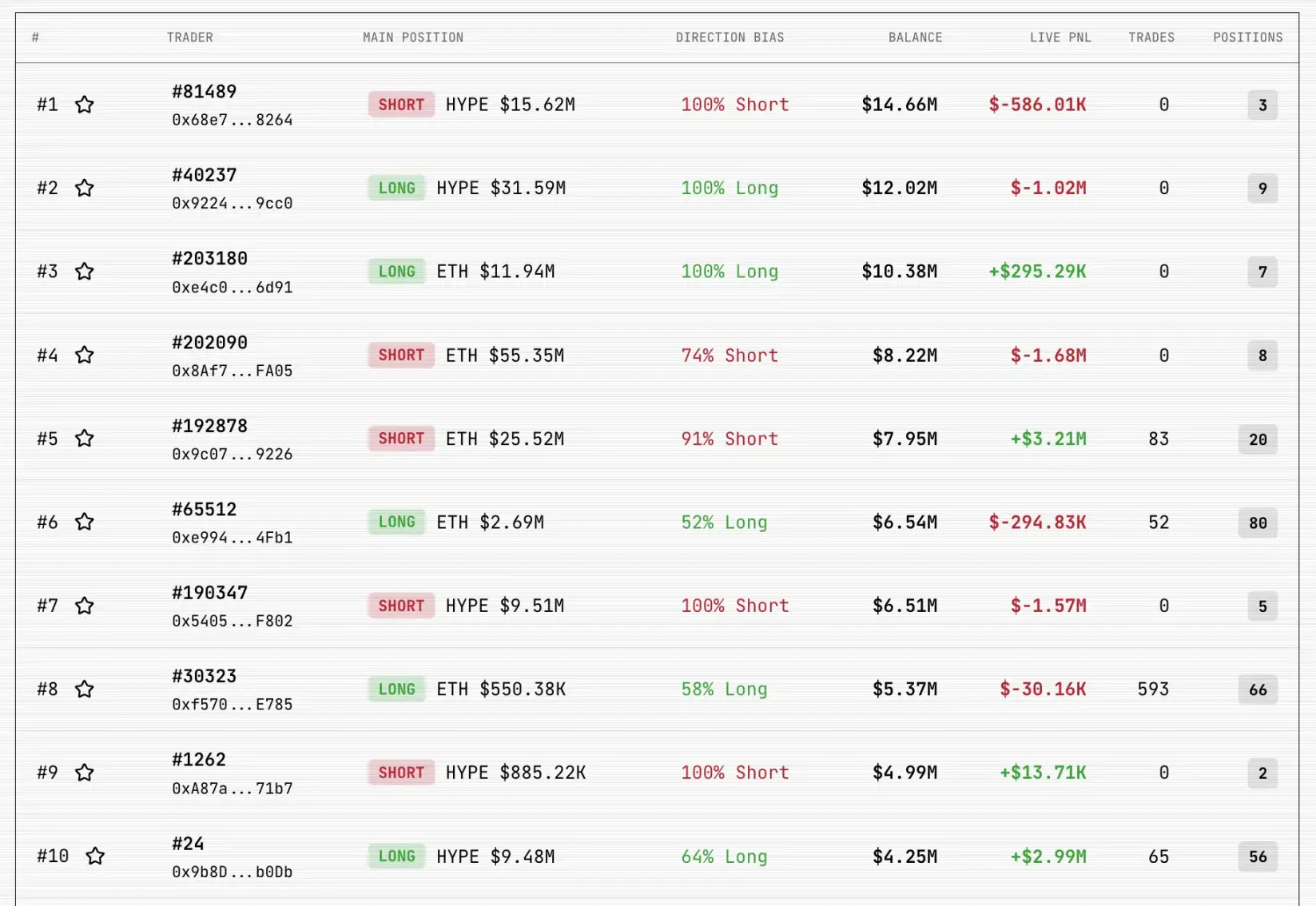 lighter 的前十名交易者主要集中交易 ETH 和 HYPE 两个品种。排行榜第一名的交易者以 ETH 空头为主要仓位,总仓位价值 2,552 万美元,已实现盈利 321 万美元,共执行 83 笔交易,持有 20 个仓位。