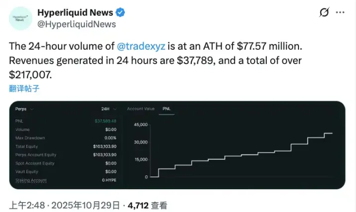 另据 Hyperliquid News: trade.xyz 创下了单日交易量历史新高,达到 7757 万美元。24 小时内产生收入 37,789 美元,累计总收入已超过 21.7 万美元。按照当前增长趋势,有分析认为到圣诞节时,trade.xyz 的交易量将超越老牌平台 dYdX。