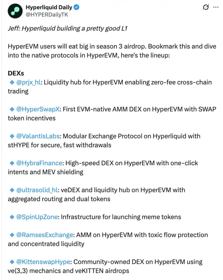Hyperliquid Daily(@HYPERDailyTK)对 HyperEVM 原生协议整理汇总,从 DeFi 协议到创新应用,HyperEVM 正在成为开发者的重要选择。