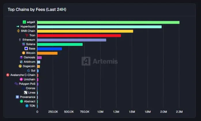 根据 Artemis 的”Top Chains by Fees”数据,edgeX 以 230 万美元的 24 小时手续费收入超越 Hyperliquid,成为新的链上手续费之王,凸显了平台的高交易活跃度和用户粘性。