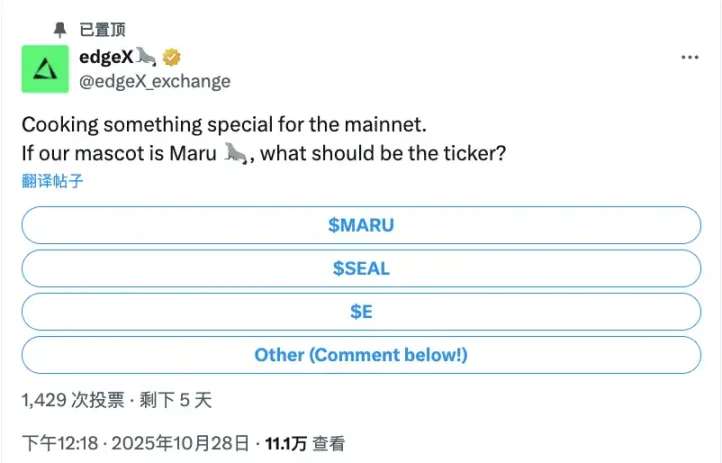 edgeX 官方推特发起了一项引发广泛关注的投票:”为主网准备特别的东西。如果我们的吉祥物是 Maru(海豹),代币符号应该是什么?”这条推文在 24 小时内获得超过 11.1 万次浏览和 141 条回复,被多家媒体解读为 TGE 即将到来的明确信号。