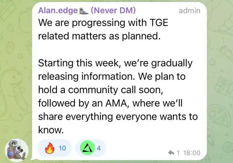 edgeX 管理员在 Telegram 群组中进一步确认,TGE 相关事宜正按计划推进。从本周开始,团队将逐步公布相关信息,不久将举行社区电话会议和问答环节,让用户充分了解代币经济模型和分配方案。