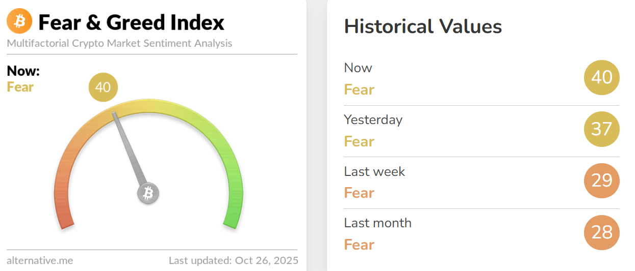 深潮 TechFlow 消息,10 月 26 日,据 Alternative.me 数据,今日加密货币恐慌与贪婪指数升至 40(昨日该指数为 37),表明市场仍处于「恐慌状态」。