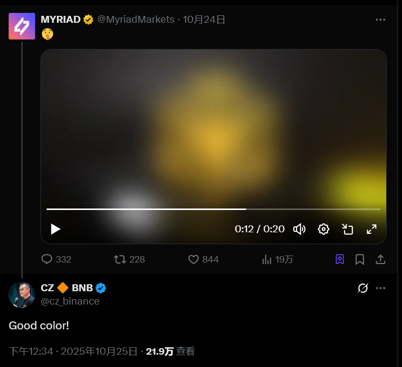 深潮 TechFlow 消息,10 月 26 日,Abstract 生态预测平台 Myriad 发布模糊视频预告,视频中出现类似 BNB Chain logo 的黄色图标。CZ 在此推文下回复“Good color”。