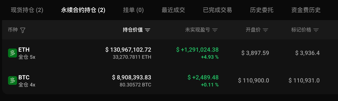 该巨鲸同时持有以太坊多单,持仓 33,270.78 枚 ETH,价值 1.32 亿美元,开仓价格为 3,897.59 美元。