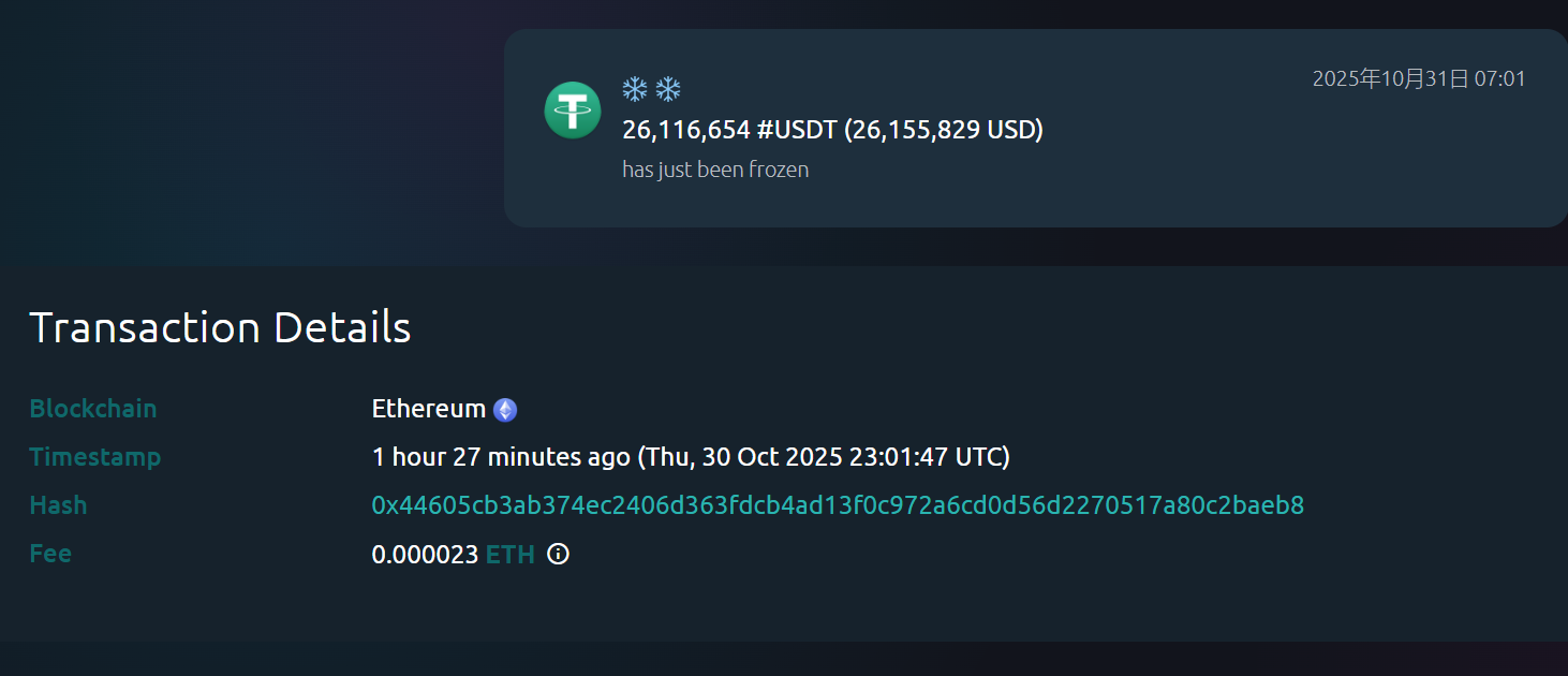 深潮 TechFlow 消息,10 月 31 日,据 Whale Alert 监测,以太坊链上一个余额为 26,116,654 枚 USDT 的地址约 1 个半小时前被冻结。