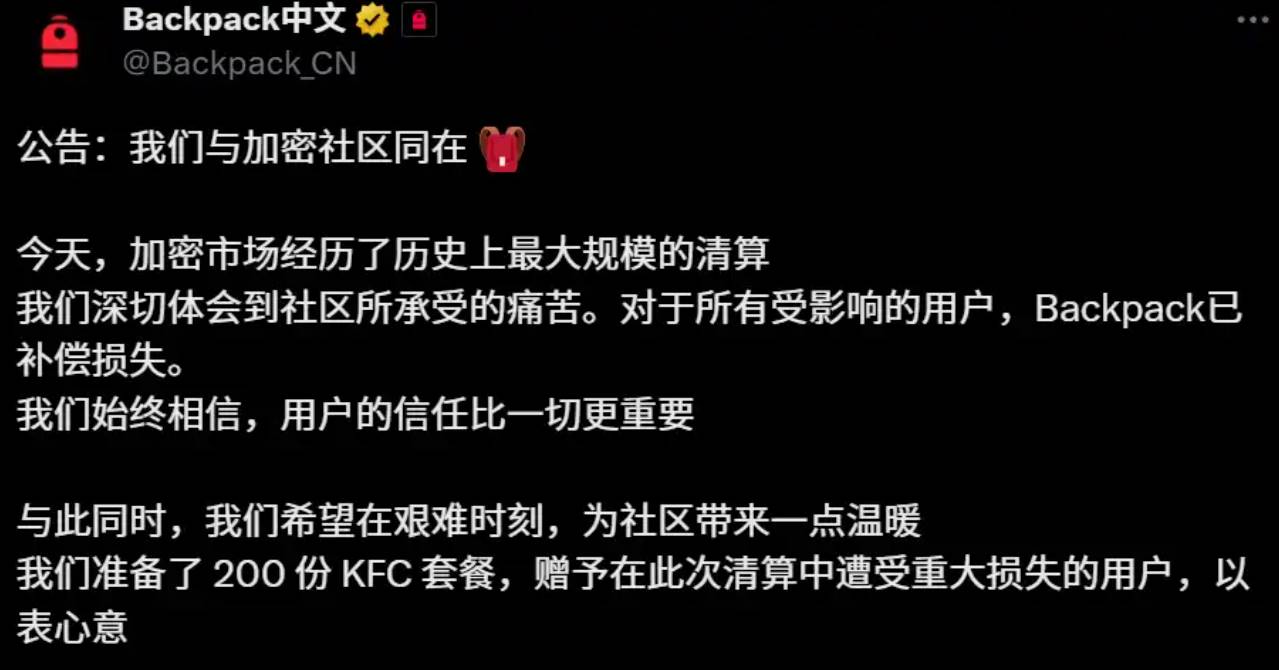 Backpack:已向市场闪崩期间受影响用户补偿损失