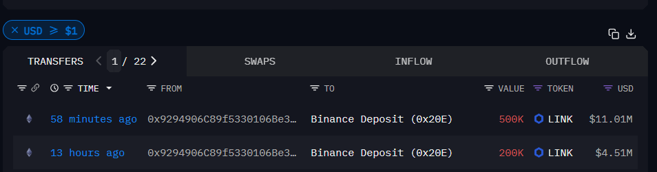 某鲸鱼过去13小时将总计70万枚LINK存入币安,价值1552万美元