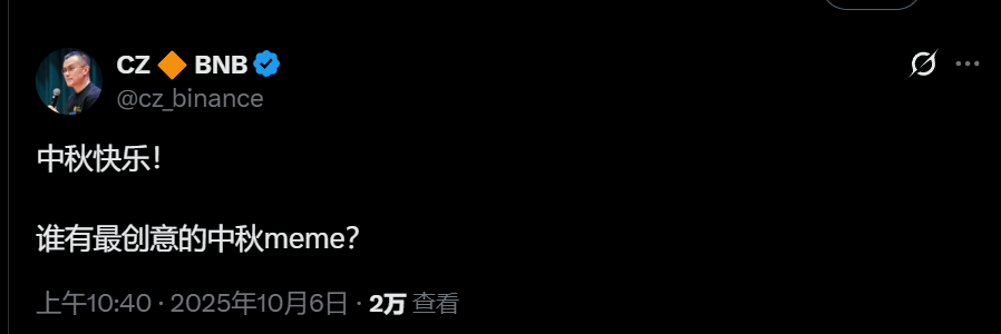 深潮 TechFlow 消息,10 月 6 日,币安创始人 CZ 在 X 平台向社区送上中秋祝福,并征集“最创意的中秋meme”。