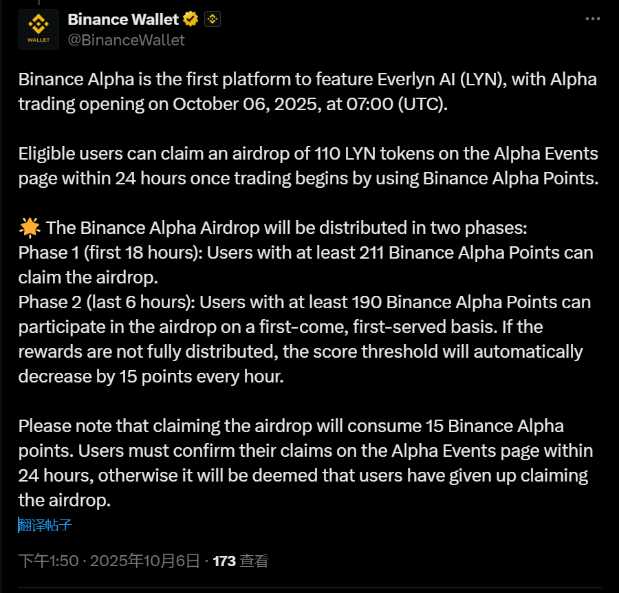 币安 Alpha:Everlyn AI (LYN) 第一阶段空投申领门槛为 211 Alpha 积分