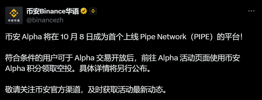 币安 Alpha 将在 10 月 8 日上线 Pipe Network(PIPE),符合条件的用户可申领空投