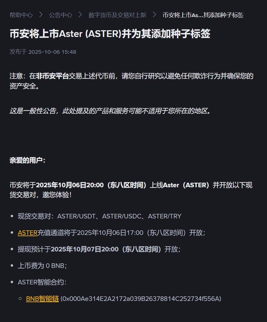现货交易对:ASTER/USDT、ASTER/USDC、ASTER/TRY;