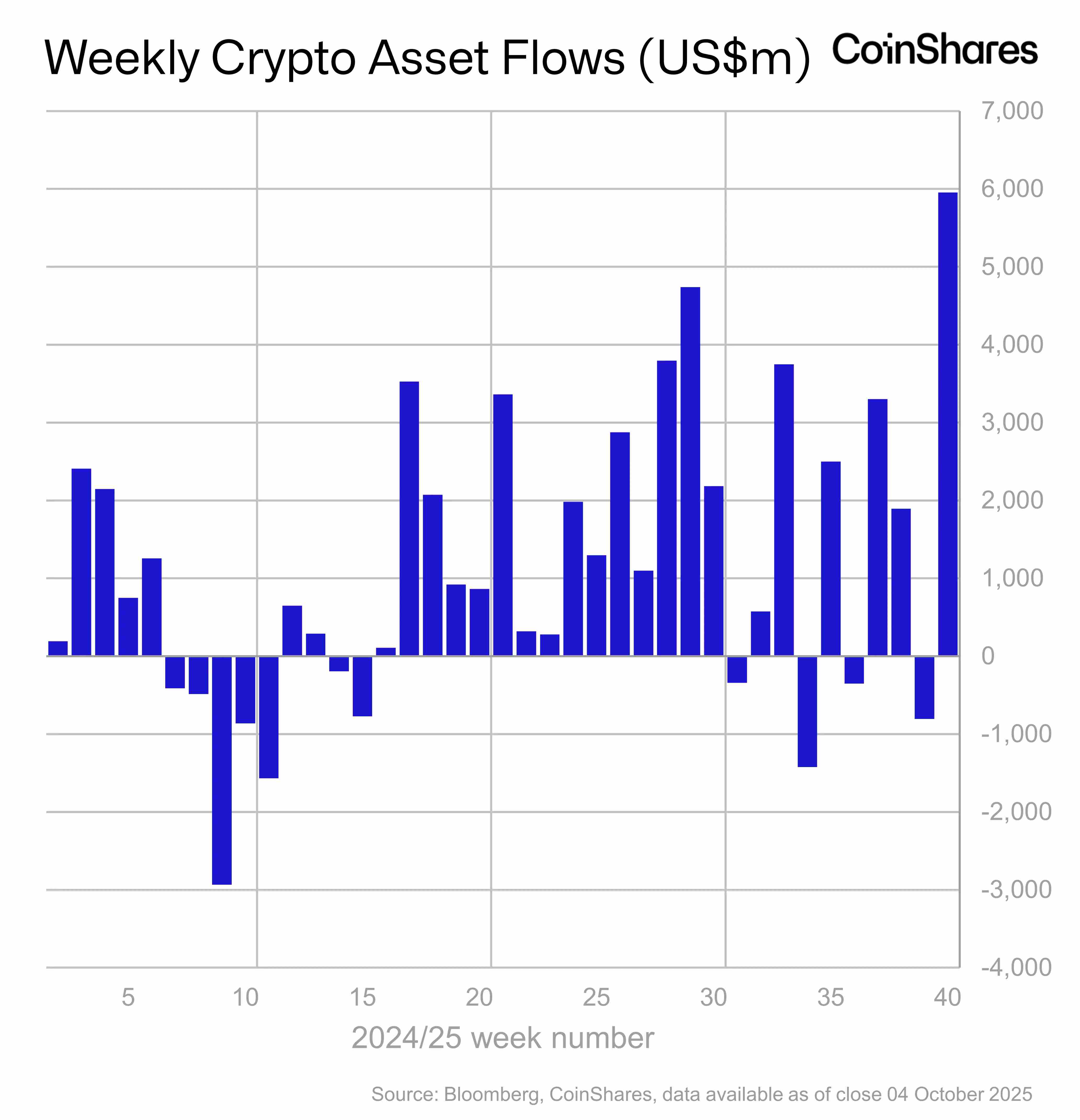 深潮 TechFlow 消息,10 月 6 日,据 CoinShares 最新周报,数字资产投资产品上周录得创纪录的 59.5 亿美元净流入,创下最大的单周流入量。CoinShares 认为,此次大规模流入是对美联储降息的延迟反应,同时受到疲软就业数据和美国政府稳定性担忧的推动。