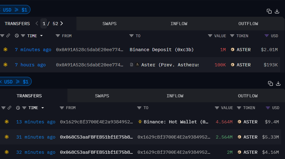 深潮 TechFlow 消息,10 月 6 日,据Arkham监测数据显示,两鲸鱼将总计556.4万枚ASTER充值进币安,价值超1000万美元,其中鲸鱼0x1629在大约13分钟前将456.4万枚ASTER充值进币安,价值940万美元;鲸鱼0x0A91则在大约7分钟前将100万枚ASTER充值进币安,价值201万美元。