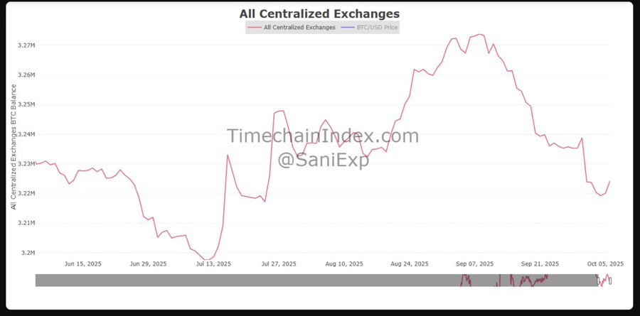 深潮 TechFlow 消息,10 月 6 日,据链上分析平台TimechainIndex创始人Sani在X平台发布数据显示,过去48小时约5000枚BTC被转入中心化交易所(CEX),目前中心化交易所内的比特币数量达到3,224,301枚BTC。