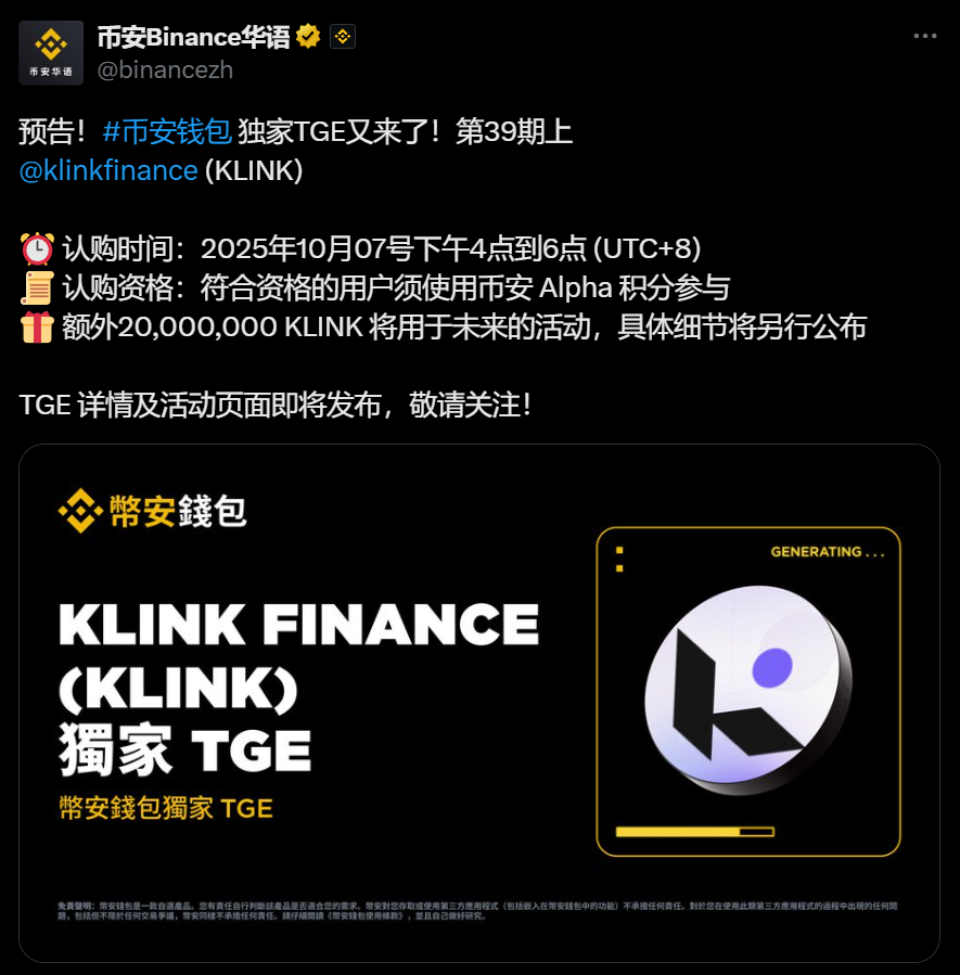 深潮 TechFlow 消息,10 月 6 日,据官方公告,币安钱包将于 10 月 7 号上线 Klink Finance (KLINK)独家 TGE 活动,具体安排如下: