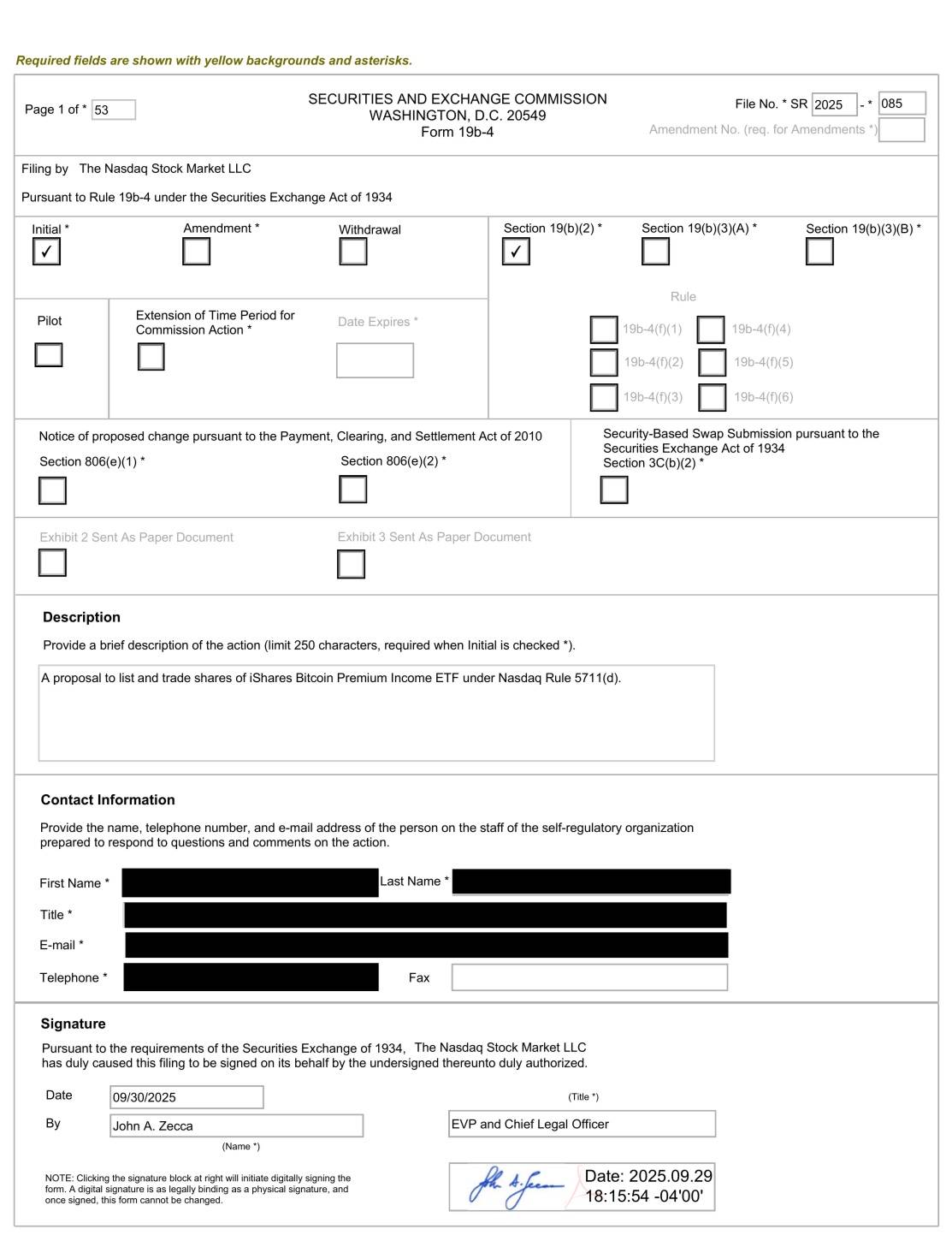深潮 TechFlow 消息,10 月 5 日,据 Bitcoin News 报道,纳斯达克已向美国证券交易委员会(SEC)提交申请,将贝莱德的比特币溢价收入ETF上市,该 ETF 将比特币敞口与溢价收入策略相结合。 拟议的 ETF 旨在吸引注重收益的投资者,同时提升比特币在传统金融中的地位。