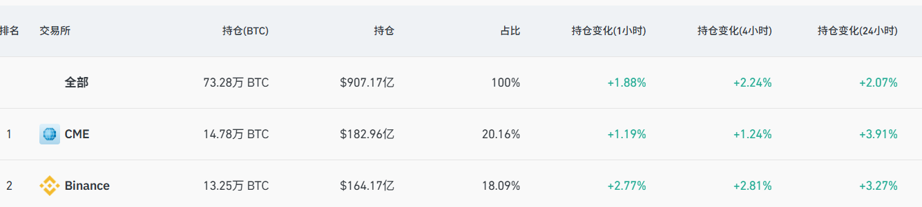 深潮 TechFlow 消息,10 月 4 日,据 Coinglass 数据,全网 BTC 合约未平仓量达到 73.45 万枚(约合 898 亿美元),24 小时涨幅 1.47%。其中,CME 以 14.78 万枚 BTC(约合 180.82 亿美元)居首,占比 20.11%,24 小时涨幅 3.96%;币安以 13.05 万枚 BTC(约合 159.85 亿美元)位列第二,占比 17.78%,24 小时涨幅 2.07%。