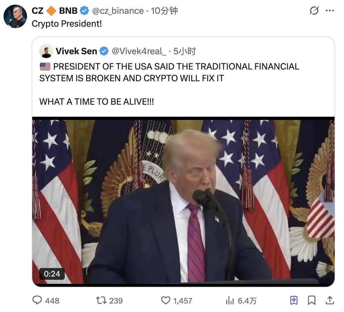 深潮 TechFlow 消息,10 月 5 日,赵长鹏转发特朗普提及加密货币的相关演讲「特朗普称传统金融体系已崩溃,加密货币将修复它」,并配文「加密总统!」