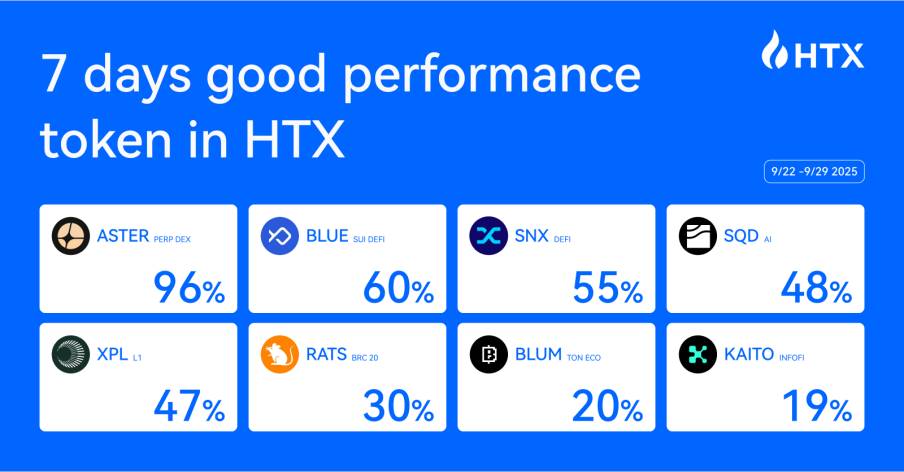 ASTER(96%|Perp DEX):Aster 提供链上永续合约与现货交易,凭借“免MEV、一键下单”等产品特色吸引了交易者关注。上线后市场热度持续发酵,过去一周代币累计上涨96%,成为火币HTX表现最突出的新币,也侧面印证了链上衍生品赛道的爆发力。