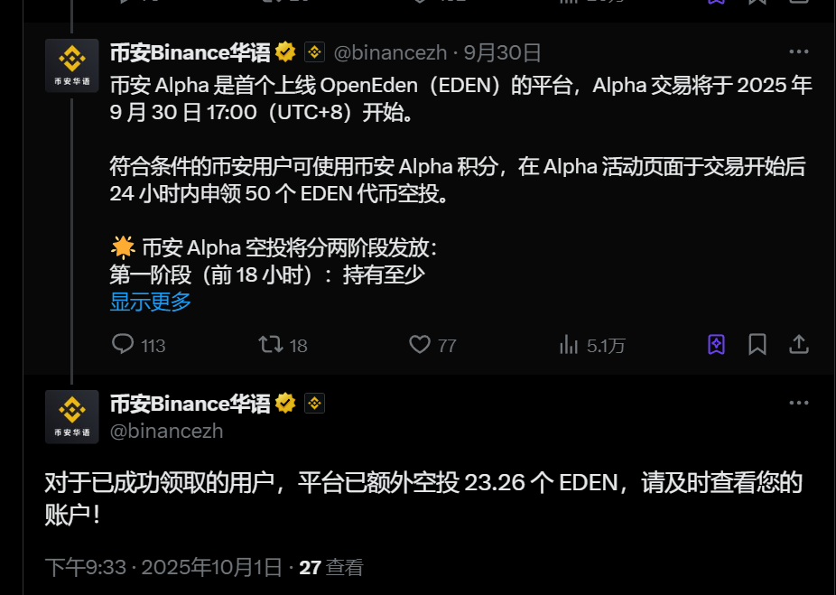 深潮 TechFlow 消息,10 月 1 日,据官方公告,针对已成功领取EDEN代币空投的用户,币安已额外发放23.26枚EDEN代币。