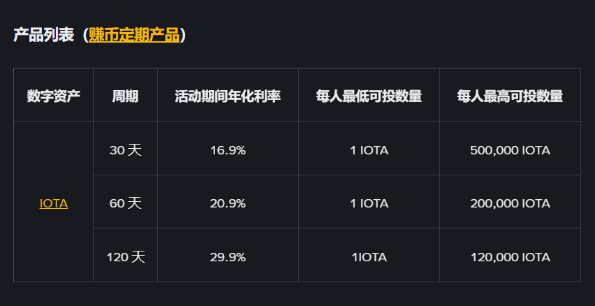 此外,据币安公告,币安赚币平台同步推出 IOTA 定期产品专属活动,提供最高 29.9% 年化收益率,活动时间为 10 月 1 日 18:00 至 12 月 29 日 17:59(东八区时间)。