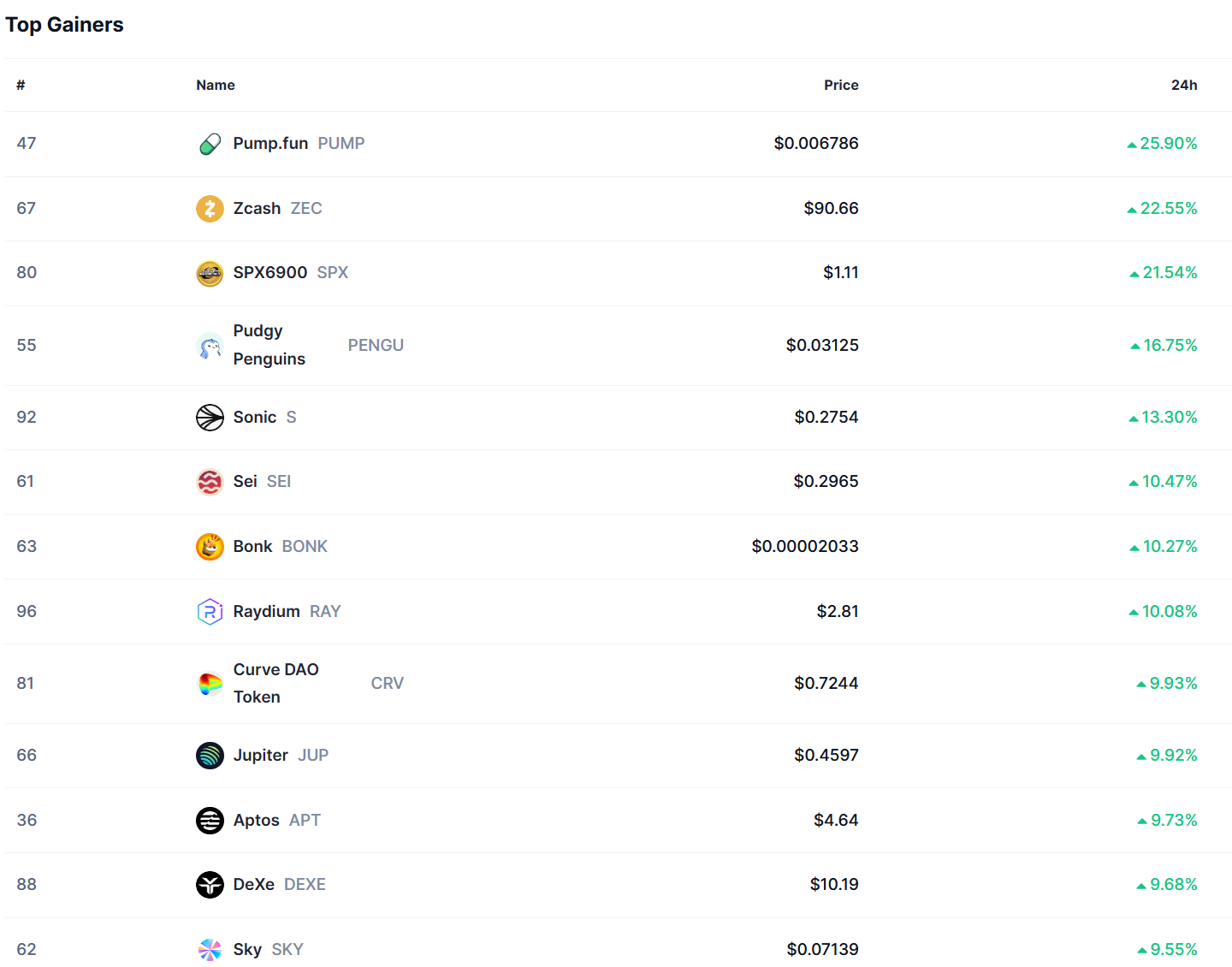 今日市值前100代币均上涨:PUMP 涨 25.90%,ZEC 涨 22.55%