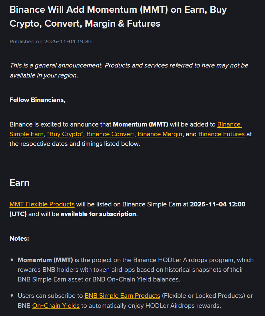 深潮 TechFlow 消息,11 月 4 日,据官方公告,币安理财、一键买币、闪兑交易平台、杠杆和币安合约将上线 Momentum(MMT)。