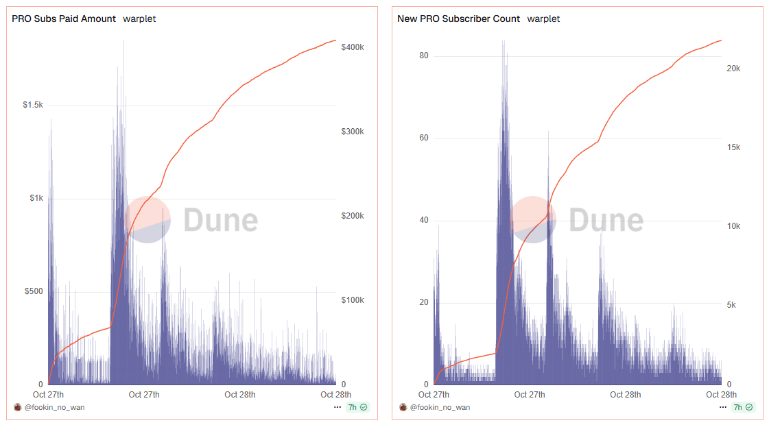 昨天(10月27日),Farcaster的日活跃用户数创下历史新高。在过去24小时内,这个链上社交网络新增了超过20,000个Pro订阅购买,总收入高达40万美元,因为用户们争相获得 Warplets 的铸造资格。