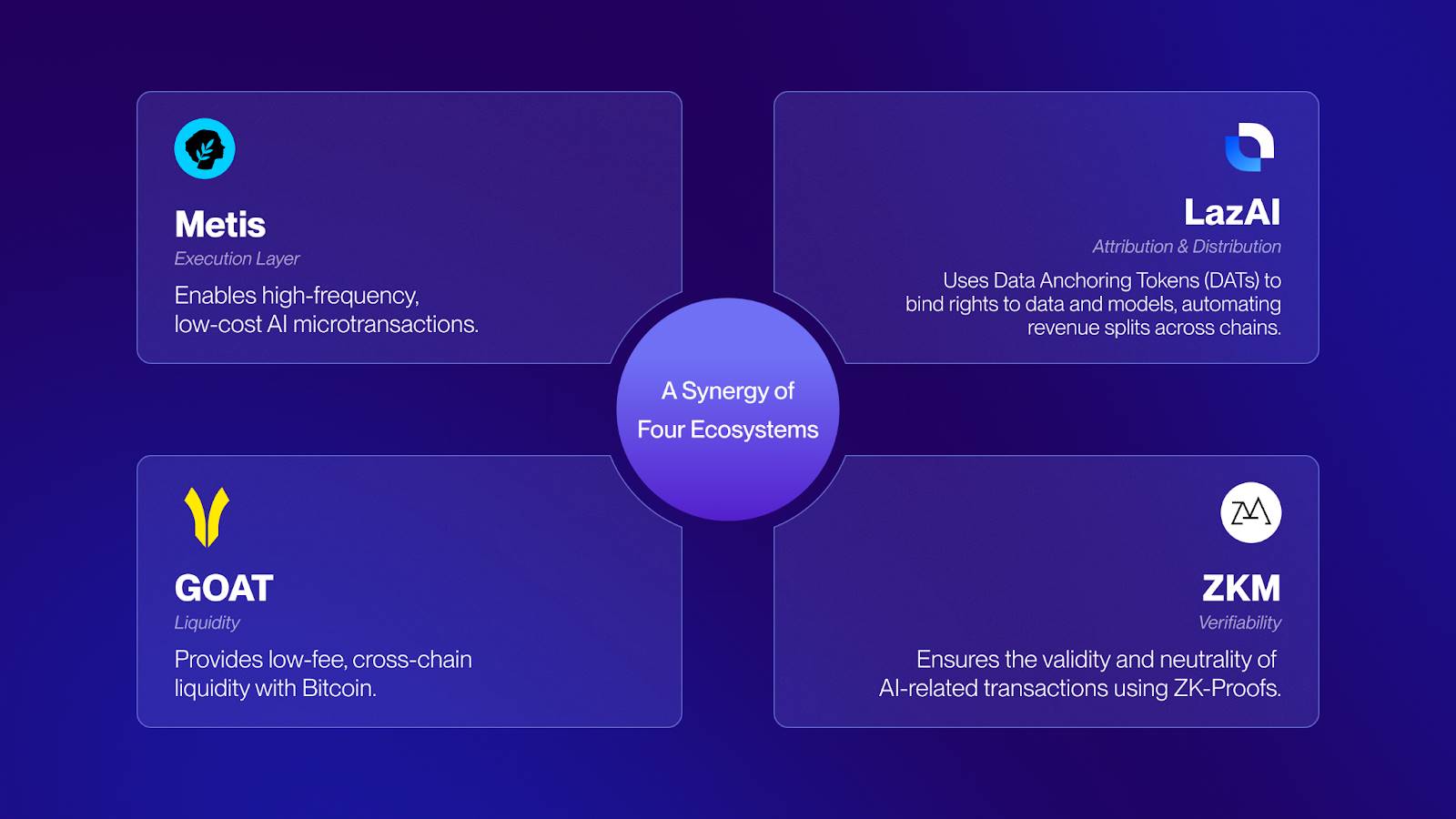 GMPayer依托四大核心力量构建技术生态:LazAI通过数据锚定通证(DAT)标准将数据来源、权利与收益直接绑定至数据集与模型;ZKM运用零知识证明确保x402交易的可验证性与去信任化;Metis作为执行与结算核心提供低费用与快速最终性;GOAT则作为原生比特币结算层通过EIP-3009与zkRollup实现超低成本跨链流动。