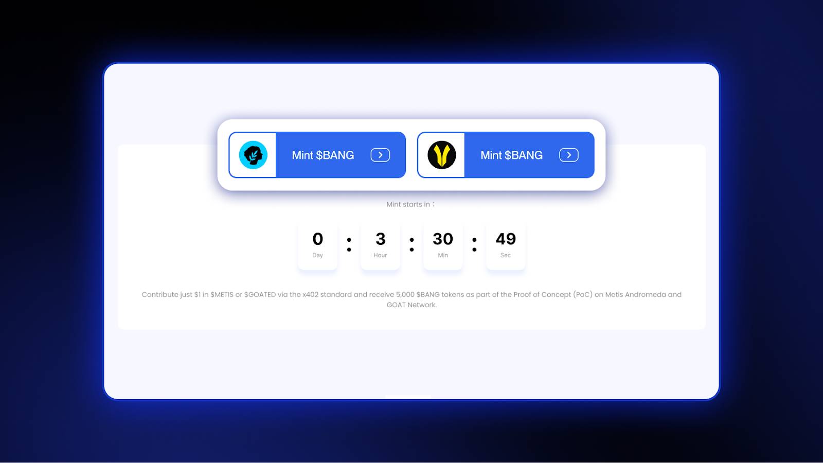 2. 只需通过x402标准在$xMETIS或$xGOATED中贡献1美元,即可获得5,000枚$BANG代币,作为METIS Andromeda和GOATNetwork PoC的一部分。
