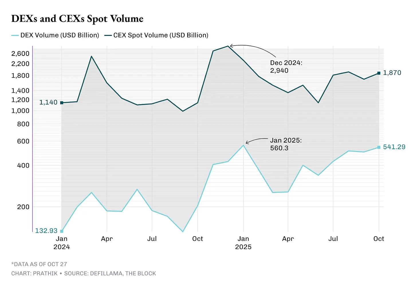 2025 年第一季度,DEX 的月均交易量为 3950 亿美元,第二季度为 3320 亿美元。到 2025 年第三季度,月均交易量增长了 50%,达到 4800 亿美元。 10 月份的交易量已超过 5400 亿美元。